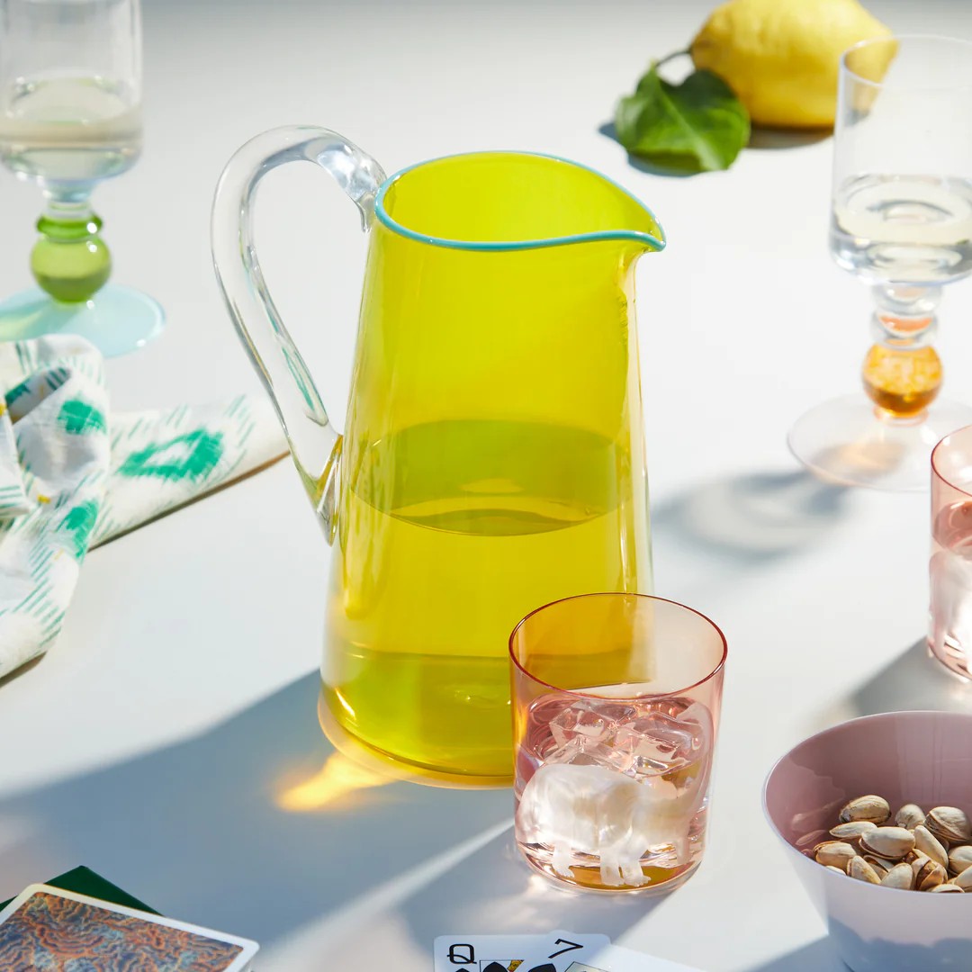 When searching for inspiration for the Miami collection, Gather looked to Dutch still life paintings, moved by the intricate shapes and fantastical narratives that feature. Selected from the series is this jug, hand-blown in founder Phoebe Stubbs’ London studio. It’s a mood-boosting picture of summertime joy, staying true to the maker’s vision with an exaggerated handle, contrasting lip wrap and candy colour palette.