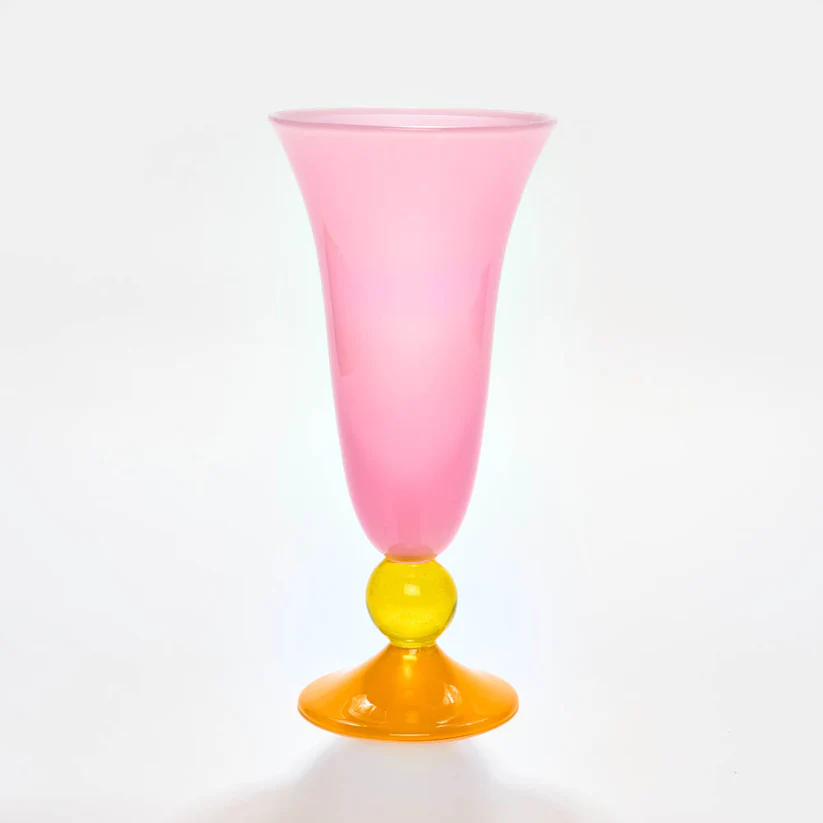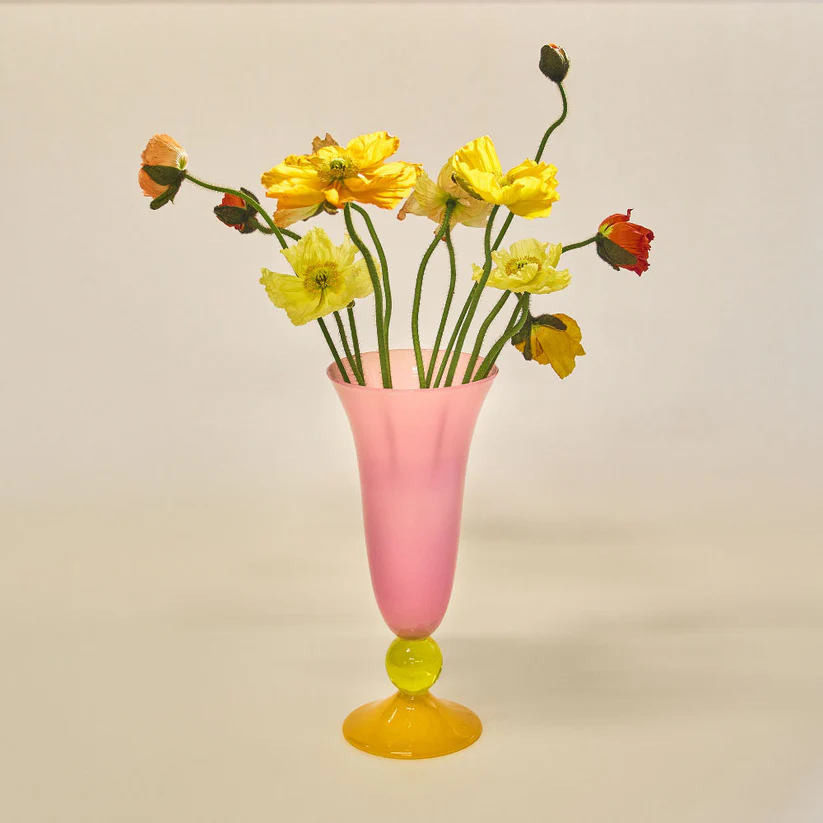 Each piece is handmade in London. The hot pink vase has a pink body, yellow ball stem and mandarin foot.