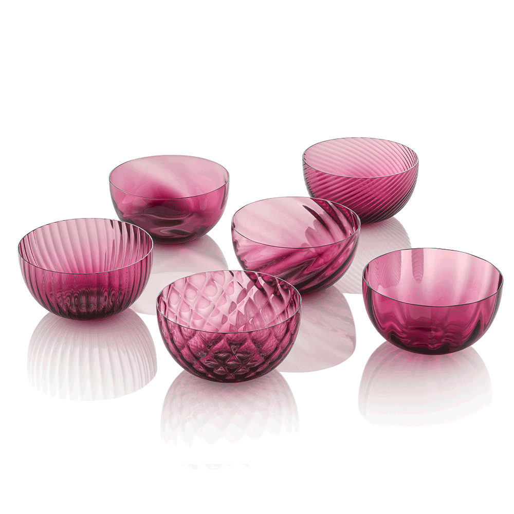 Elegant and refined, the Idra Bowl (Set of 6) from Nason Moretti adds lasting visual appeal to any tabletop. Handcrafted in Italy, these blown glass bowls each feature a different texture for a dynamic table setting that is equal parts playful and chic. Use for ice cream, salads, or appetizers, for an elevated meal, morning or night.