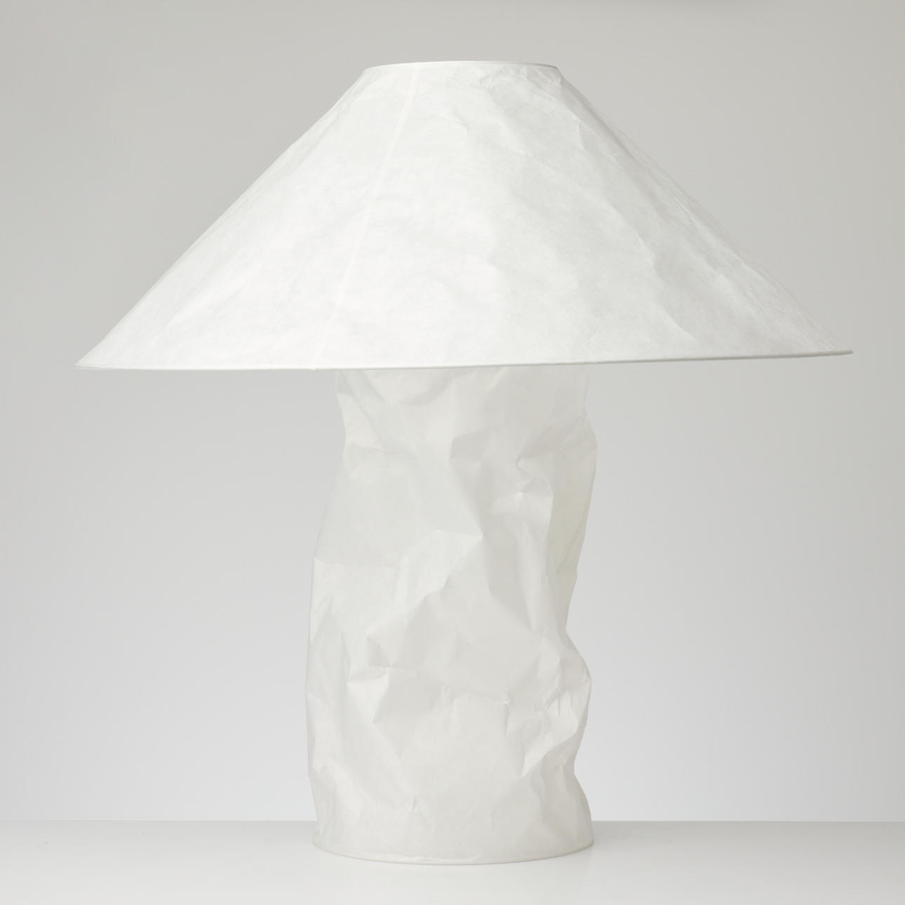 Japanese paper, metal. Lampampe is part of a series of simple lamps made of Japanese paper that Ingo Maurer developed in the late 1970s / early 1980s. In this design, he takes up the shape of traditional lampshades and yet formulates a new aesthetic. The shades are handmade in our production facility in Munich. The paper creates a soft, completely glare-free light. The paper is slightly creased as a deliberate design element.