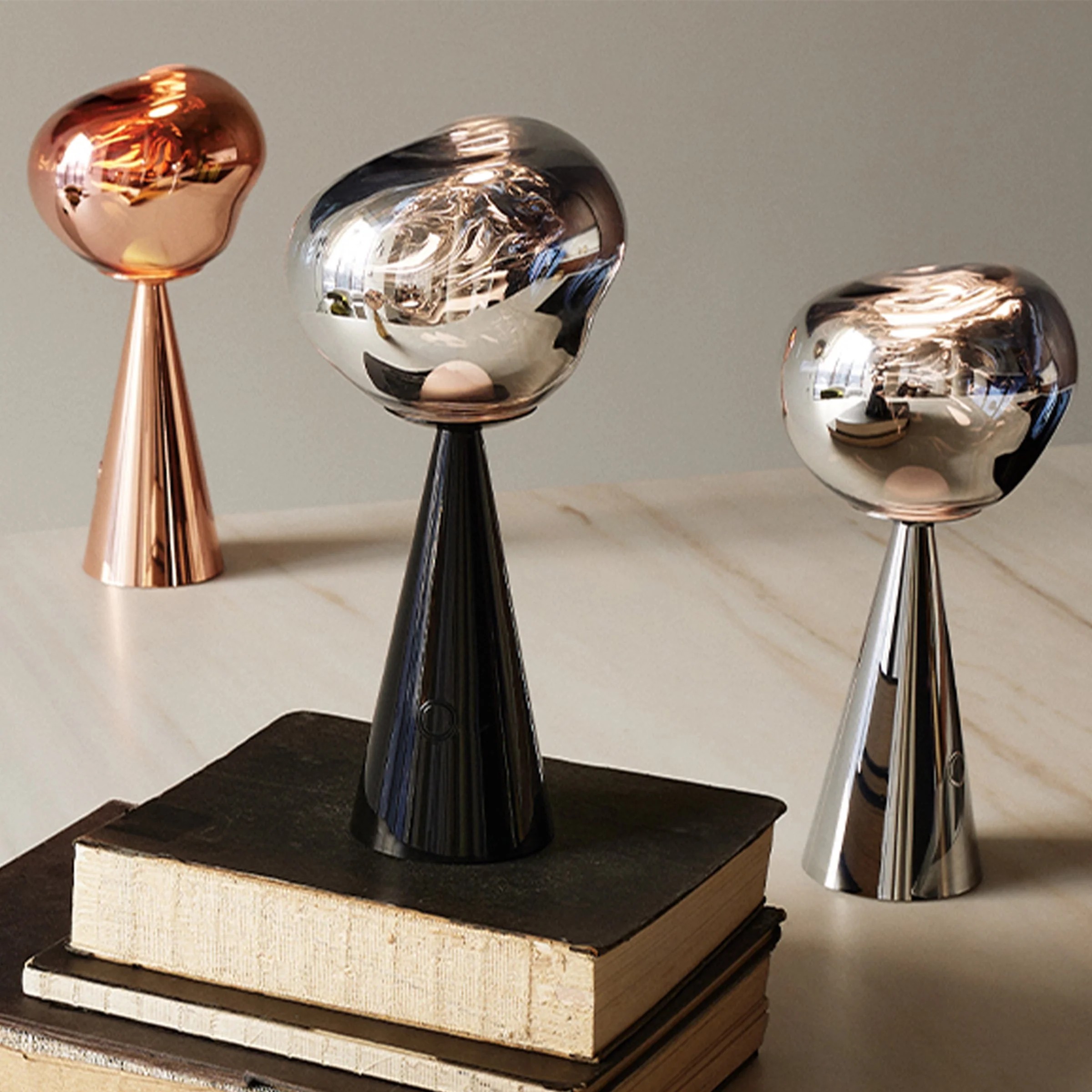 Melt Portable expands the collection with a portable design, offering the same mesmerizing hot-blown glass effect when on and a mirror-finish effect when off. Made in Germany using high-tech manufacturing, it evokes molten glass or the interior of a melting glacier.