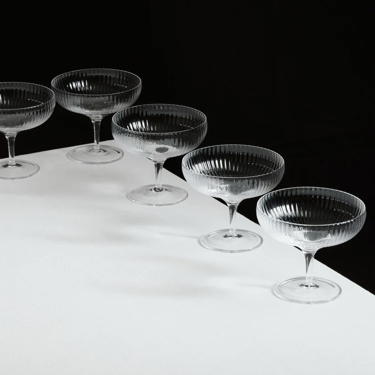 Glass coupe suitable for sparkling wines and small dishes. These glasses have a timeless design and are transparent.
