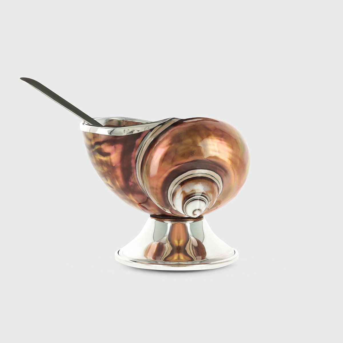 This exclusive sugar bowl is created from the rare Turbo imperialis shell, highlighting its natural bronze tones and iridescent interior. To honor and protect this remarkable species, only 100 pieces will be produced, each individually engraved with a unique number 01/100.